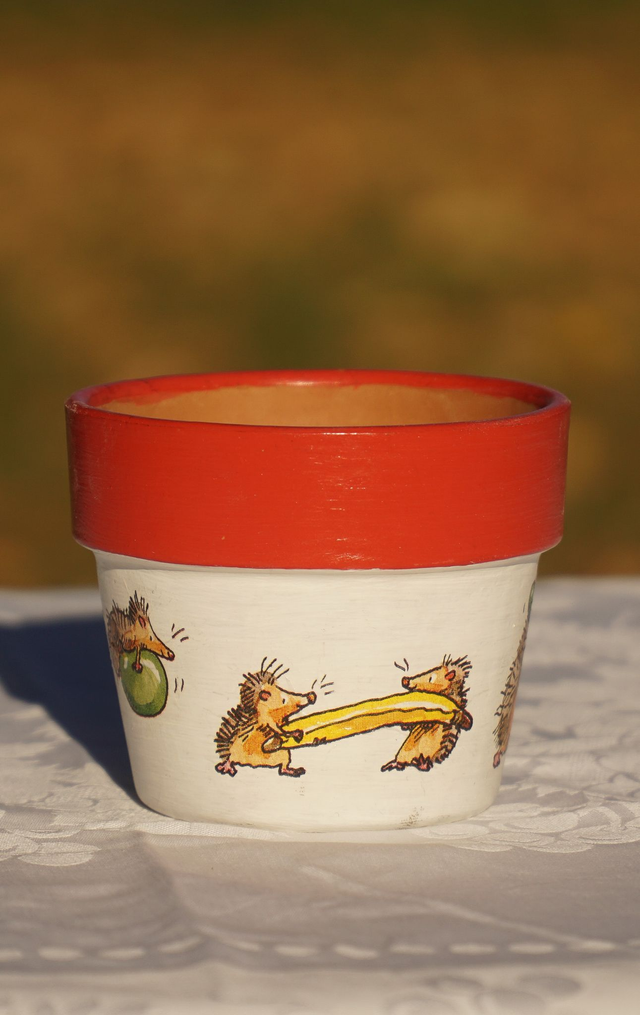 Bringen Sie die bunte Stimmung des Herbstes direkt in Ihr Zuhause! Dieser Übertopf mit Igelmotiv wurde in Handarbeit mit Serviettentechnik gestaltet und macht jeden Blumentopf zu einem einzigartigen Dekorstück.