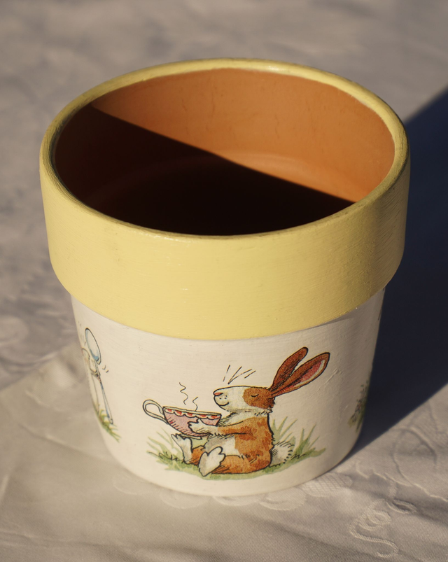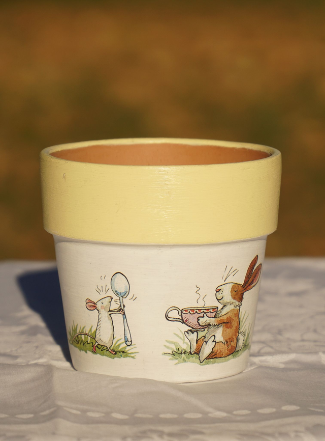 In aufwendiger Serviettentechnik gefertigt, zeigt dieses einzigartige Stück ein zauberhaftes Motiv: Ein Eichhörnchen, Mäuse und Kaninchen sitzen gemeinsam bei einer gemütlichen Teeparty im Garten.Die feinen Details und sanften Farben lassen das Motiv lebendig wirken und machen den Übertopf zu einem echten Blickfang.